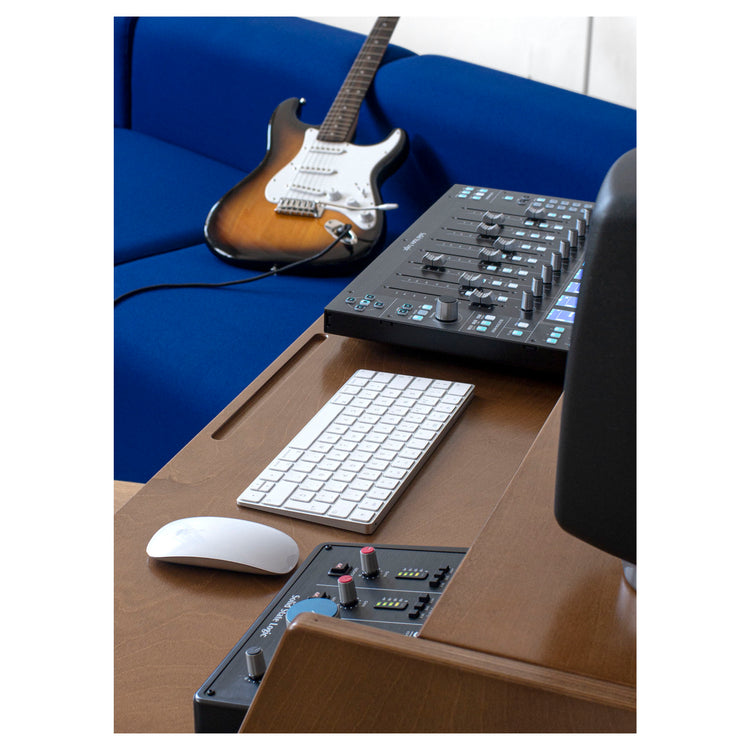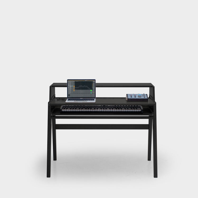 The Compact One has been designed to let big ideas come to life even in the smallest of spaces. Despite only measuring 115 cm wide it can host most 61 keys controllers and is flexible enough to let you create unique setups that fits your music and your specific workflow. Cable management slots are integrated at the back of the furniture, the upper tray can be adjusted in height, and we offer a growing line of accessories - from headphone hooks to rack extensions - to adapt it even further.